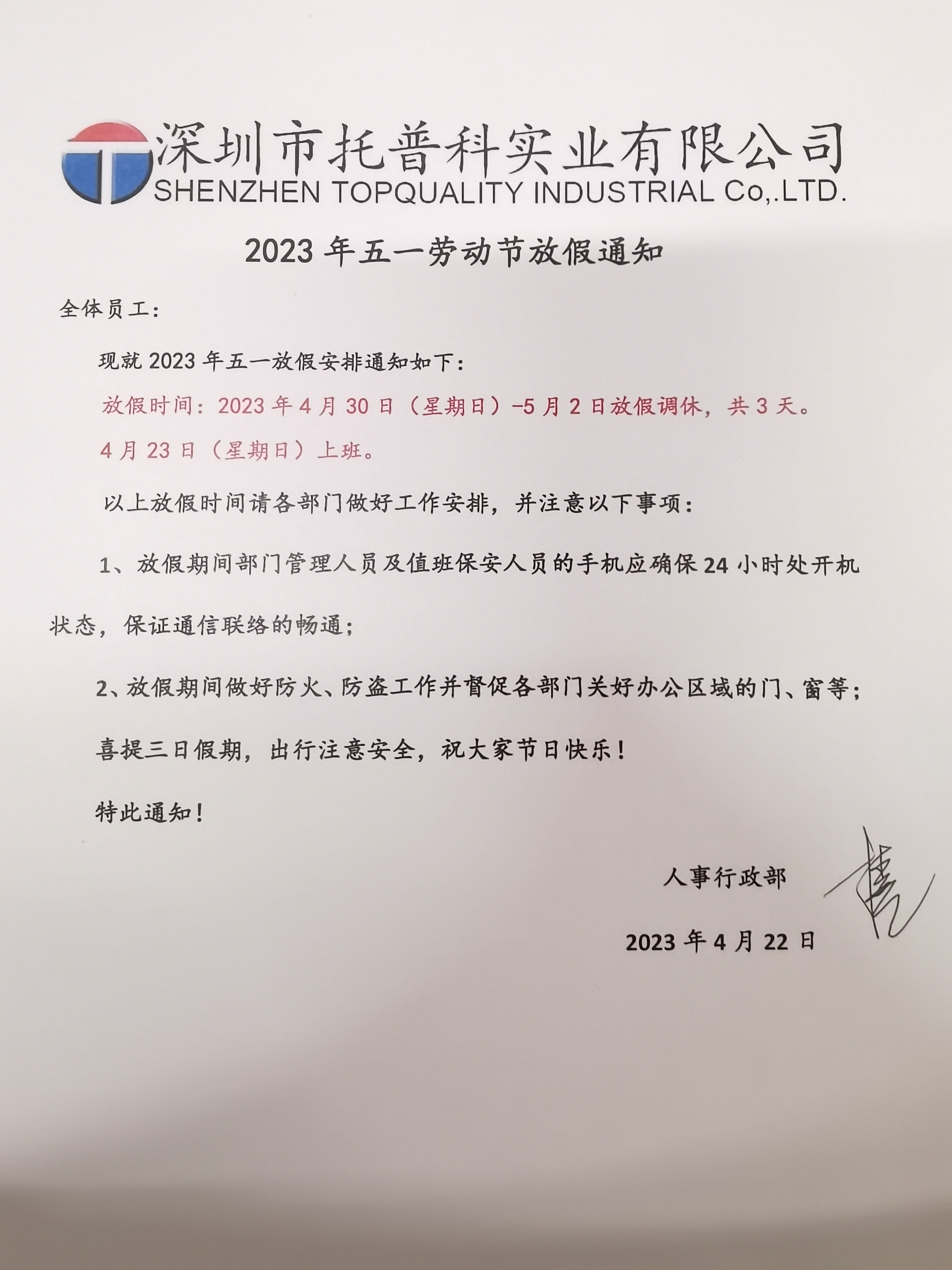 2023年五一勞動節即將臨近,根據公司實際生產經營情況以及國家有關五一勞動節放假安排,現公布2023年深圳托普科實業五一勞動節放假通知: