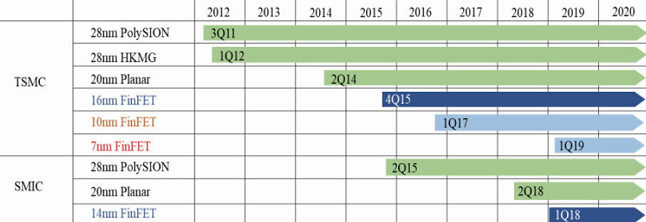 上圖為中芯國際與臺積電制程工藝時間差距